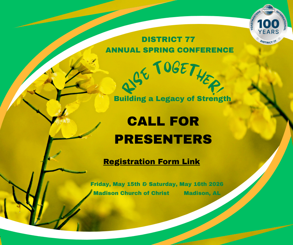 This signature District 77 event brings together Toastmasters from across the district—leaders, learners, and visionaries united by a shared passion for communication, leadership, and personal growth.