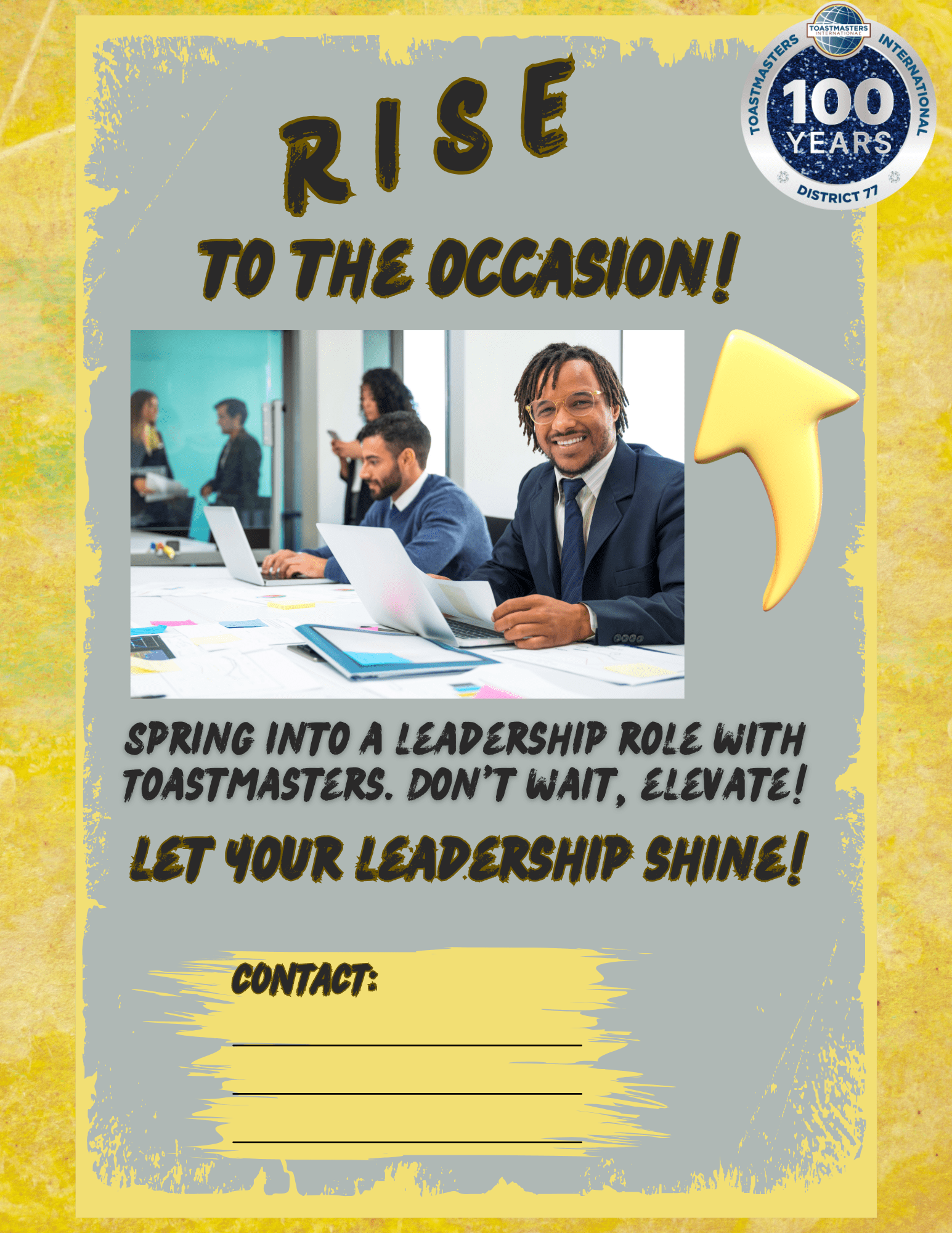 April is the month to ELEVATE and take charge of your Toastmasters journey! In the midst of Speech Contest season, District 77 clubs are encouraged to showcase your club’s energy, warmth, and impact, while welcoming guests who are ready to grow in the year ahead while encouraging them to join in the Toastmasters’ experience.